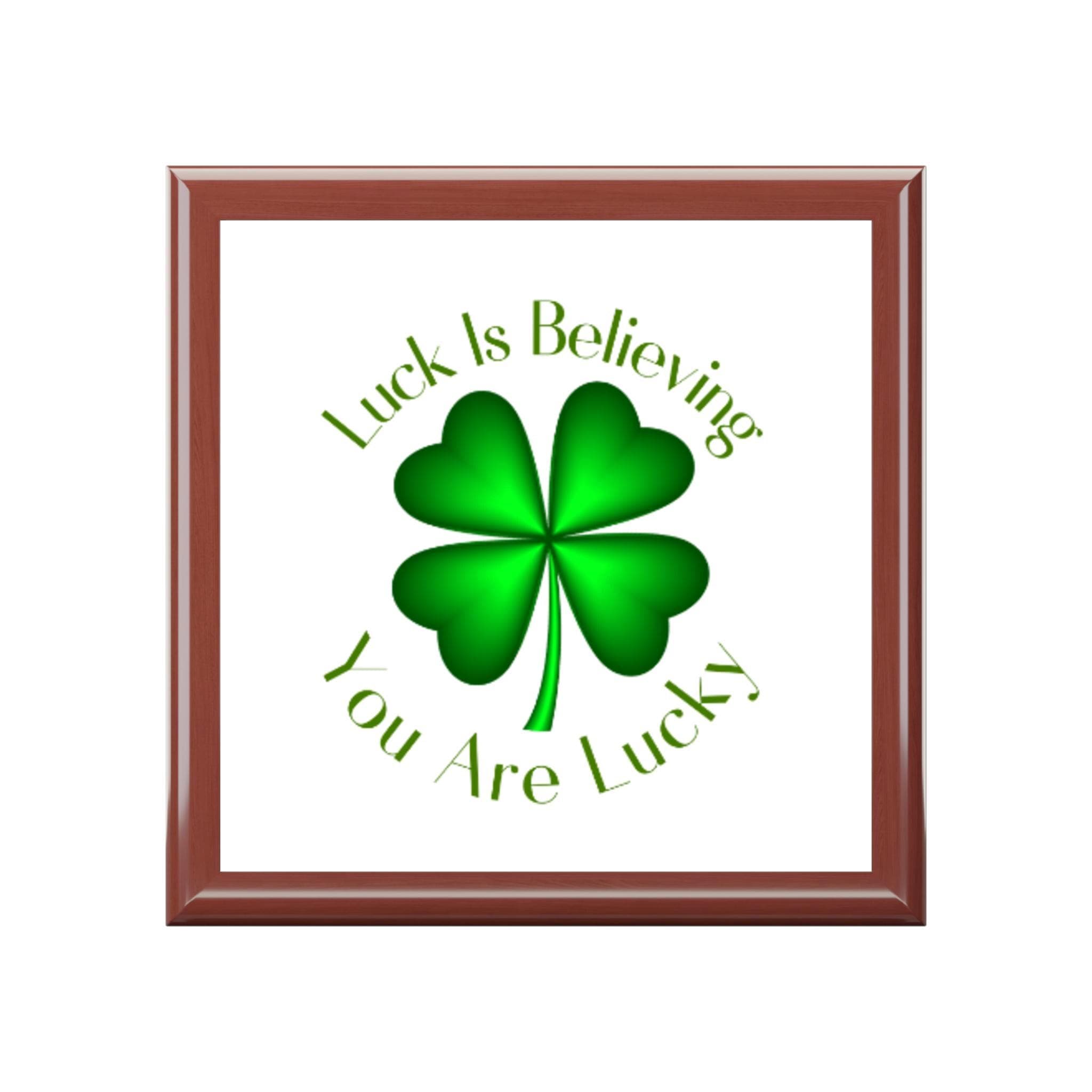 This glossy wooden jewelry box brings a quiet, hopeful charm to a dresser or desk. The 6” ceramic tile lid features a bright green four-leaf clover and the uplifting phrase “Luck Is Believing / You Are Lucky,” set into a high-gloss frame that catches light and attention. Inside, soft felt cradles rings, necklaces, and small keepsakes while dual hinges hold the lid open at 90 degrees for easy access. A slip-resistant felt base keeps the box steady on dressers or vanities. Choose from three glossy color options to match a room’s mood—each finish highlights the varnished rubberwood grain beneath. This piece feels sentimental and slightly whimsical, a small daily reminder of optimism and charm.