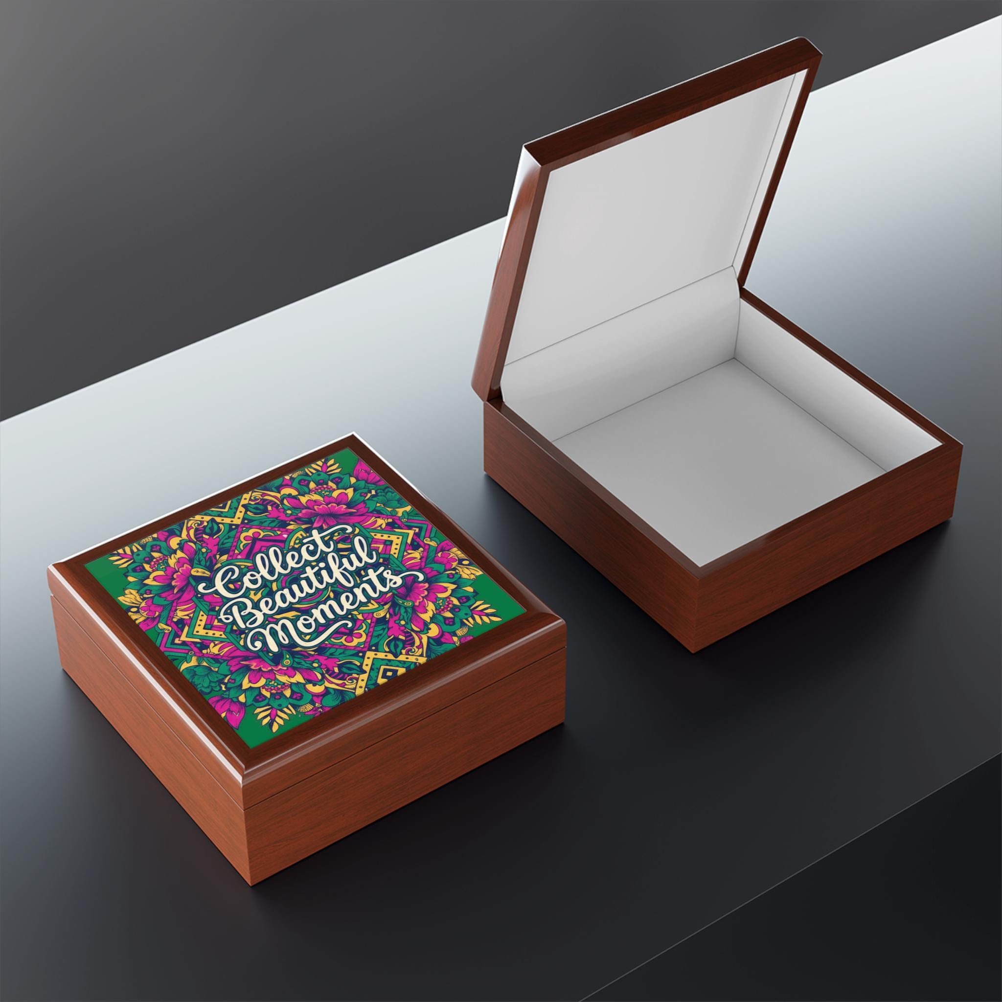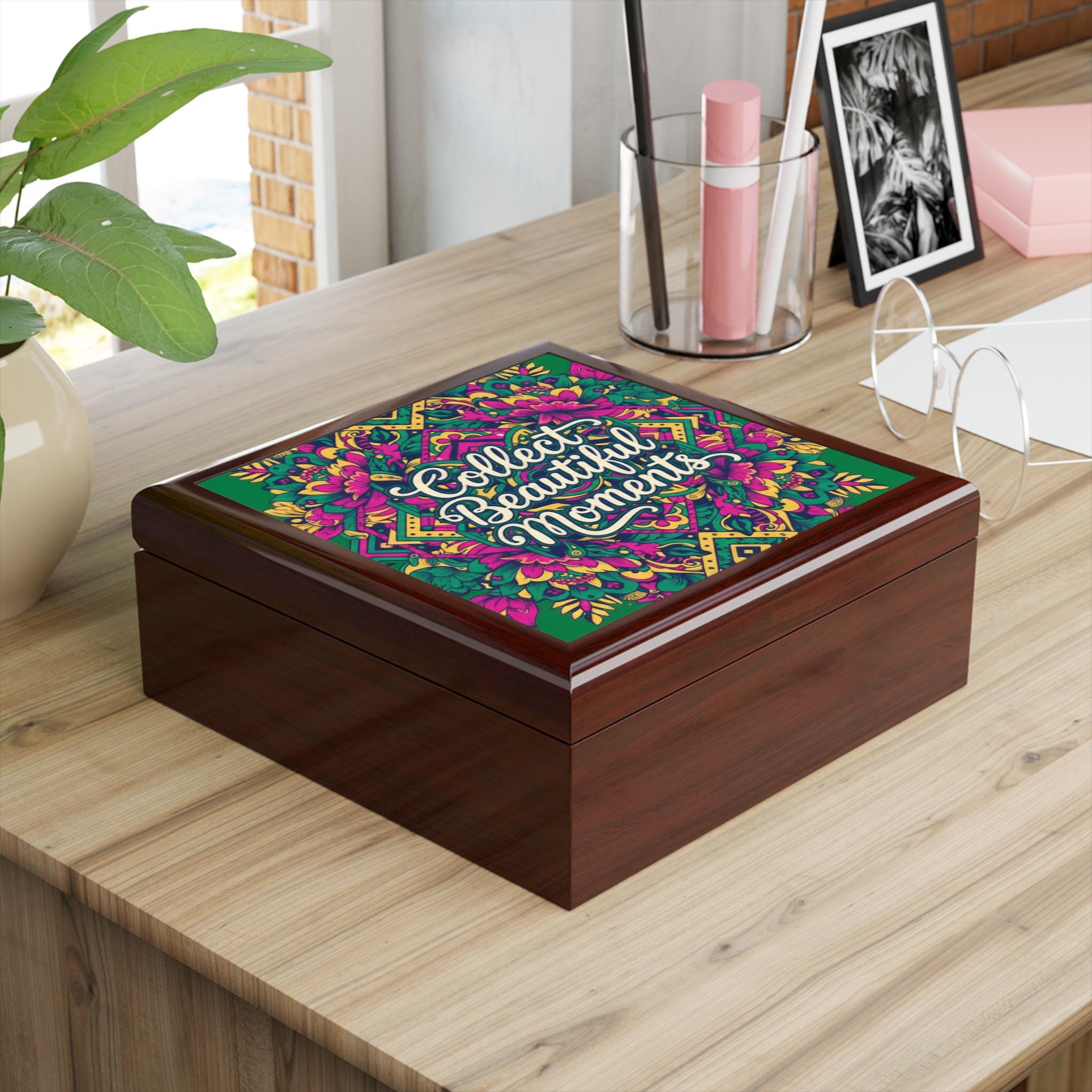 This jewelry box feels like a quiet pause in a busy day — a small, steady place to tuck away rings, bracelets, and the little tokens that carry memory. The floral mandala tile on the lid catches light against a glossy surface, drawing the eye to its intricate, meditative pattern. Inside, soft felt cradles each piece so metal doesn’t catch or scratch. Dual hinges hold the lid open at ninety degrees, giving you easy access when you’re selecting a keepsake to wear or passing a moment on to someone else. The rubberwood body has a warm, tactile weight and a slip-resistant felt base keeps the box settled on dressers or bedside tables. It’s made to live with you — to age gently and hold whatever moments you decide to keep there.