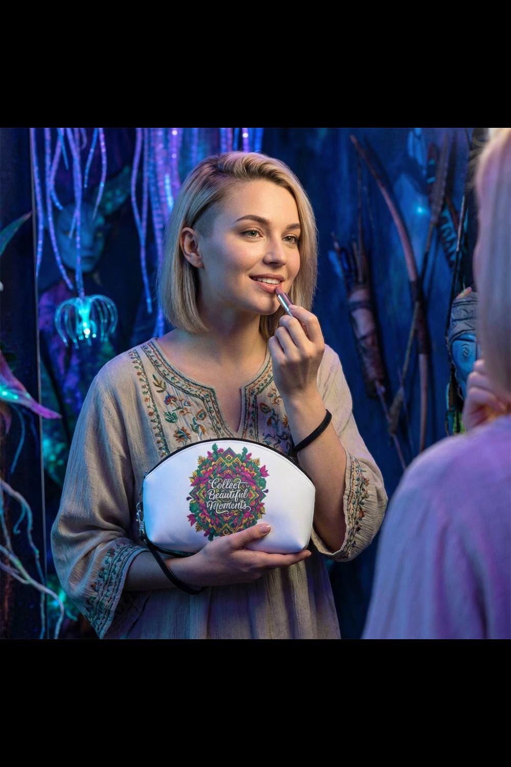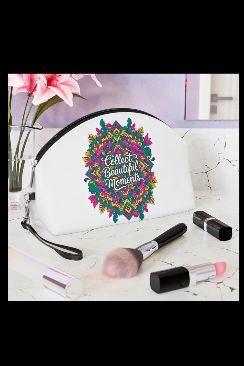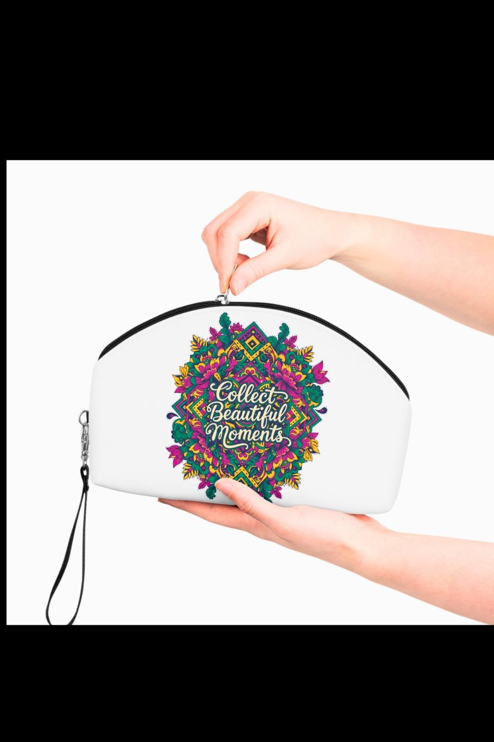 Soft to the touch yet built to go anywhere, this floral mandala makeup bag holds more than cosmetics—it holds small moments. The intricate mandala blooms across a vibrant surface with the words “Collect Beautiful Moments” tucked into the design, inviting you to slow down and savor the tiny rituals of getting ready. Compact and curved to fit into tote corners, it slips into travel kits and bedside drawers alike. The detachable leather strap lets you carry it like a wristlet or stow it away. Inside, a single black-lined compartment keeps brushes and color together without fuss. Use it for everyday touch-ups, weekend escapes, or as a thoughtful keep-sake that travels with you to weddings, showers, or simple city mornings when you want a little beauty at hand.
