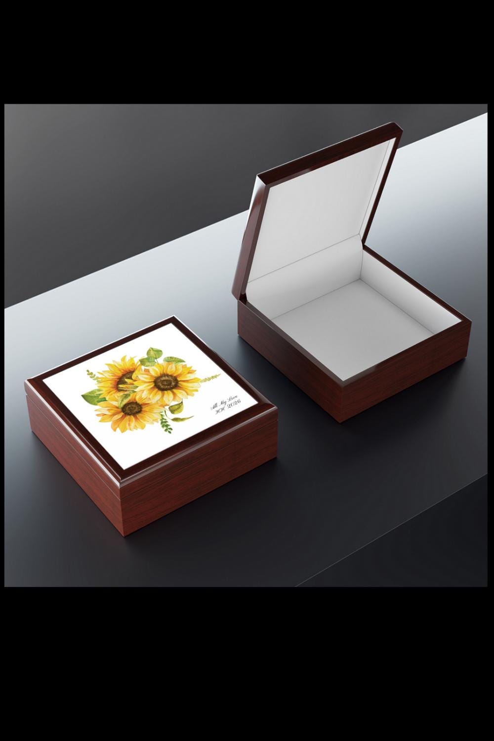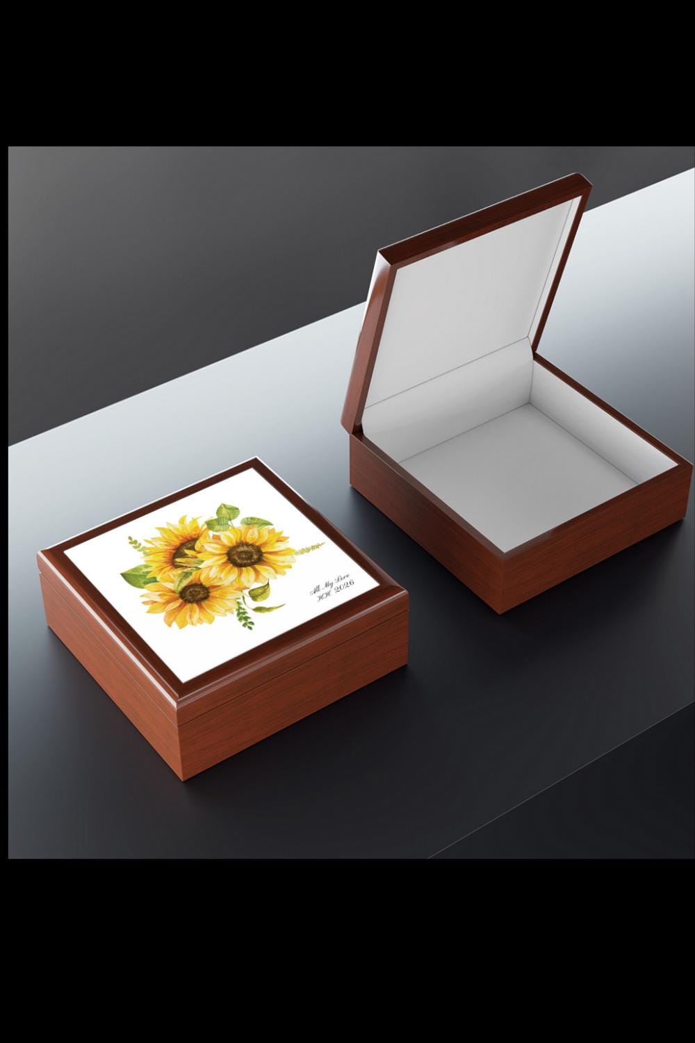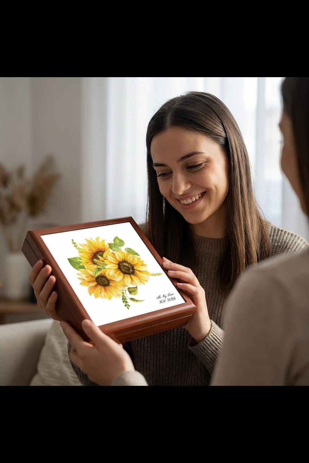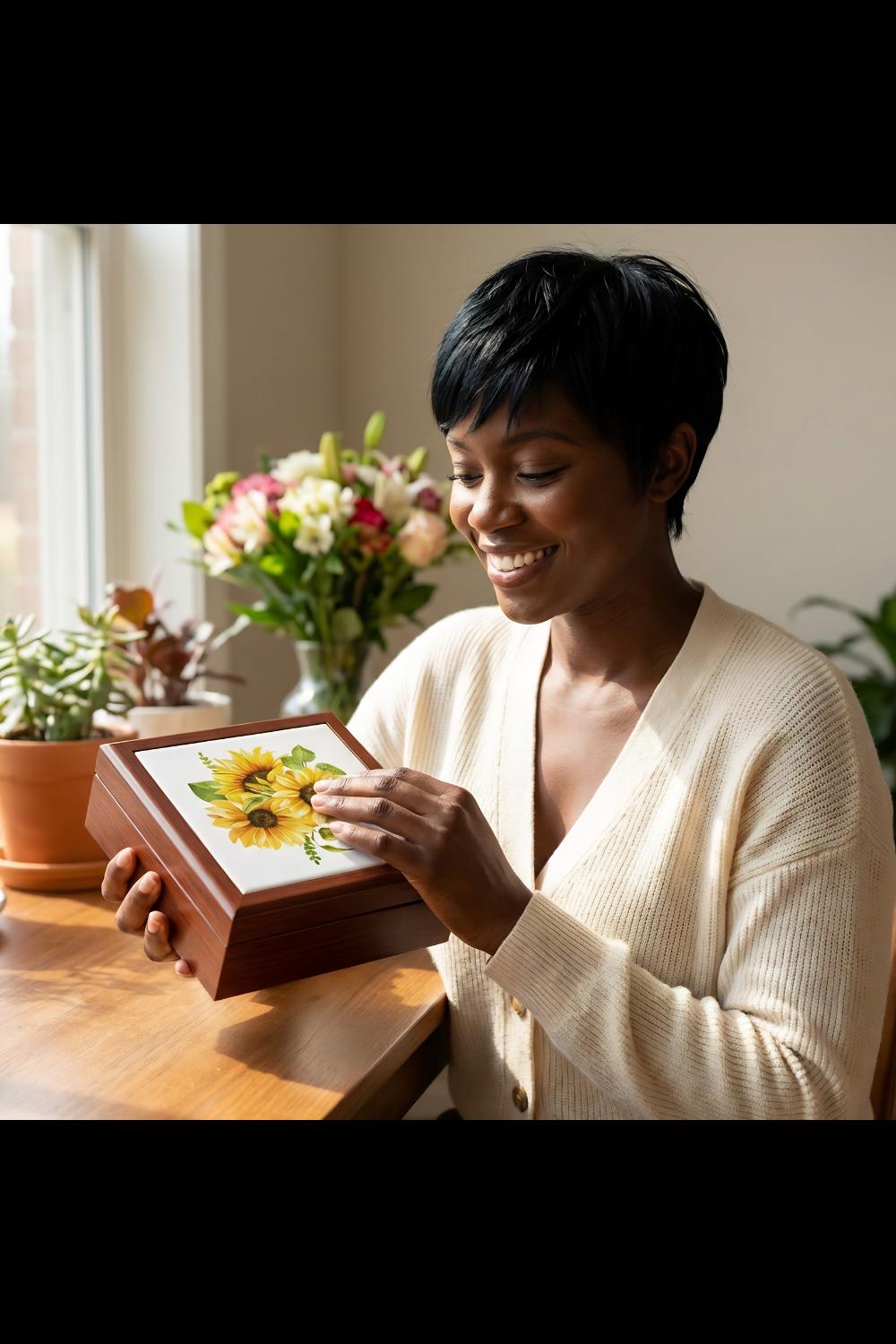A warm, sunlit keepsake for anyone who cherishes small moments. This compact wooden jewelry box holds rings, studs, and tiny treasures with quiet care. The glossy sunflower-tiled lid catches light and attention, while the soft felt interior cradles pieces so they don’t clink. When you lift the lid and the dual hinges settle at a steady 90°, it feels like unfolding a memory — a small ritual that suits slow mornings, afternoon rituals, and evenings spent sorting through keepsakes. It fits on a dressing table or a bedside shelf and brings a cheerful, handcrafted note to housewarmings, birthdays, or gentle daily routines for people who love floral details and thoughtful, functional design. Box size: Width-7.24 inches, Height-2.76, Depth-7.24.