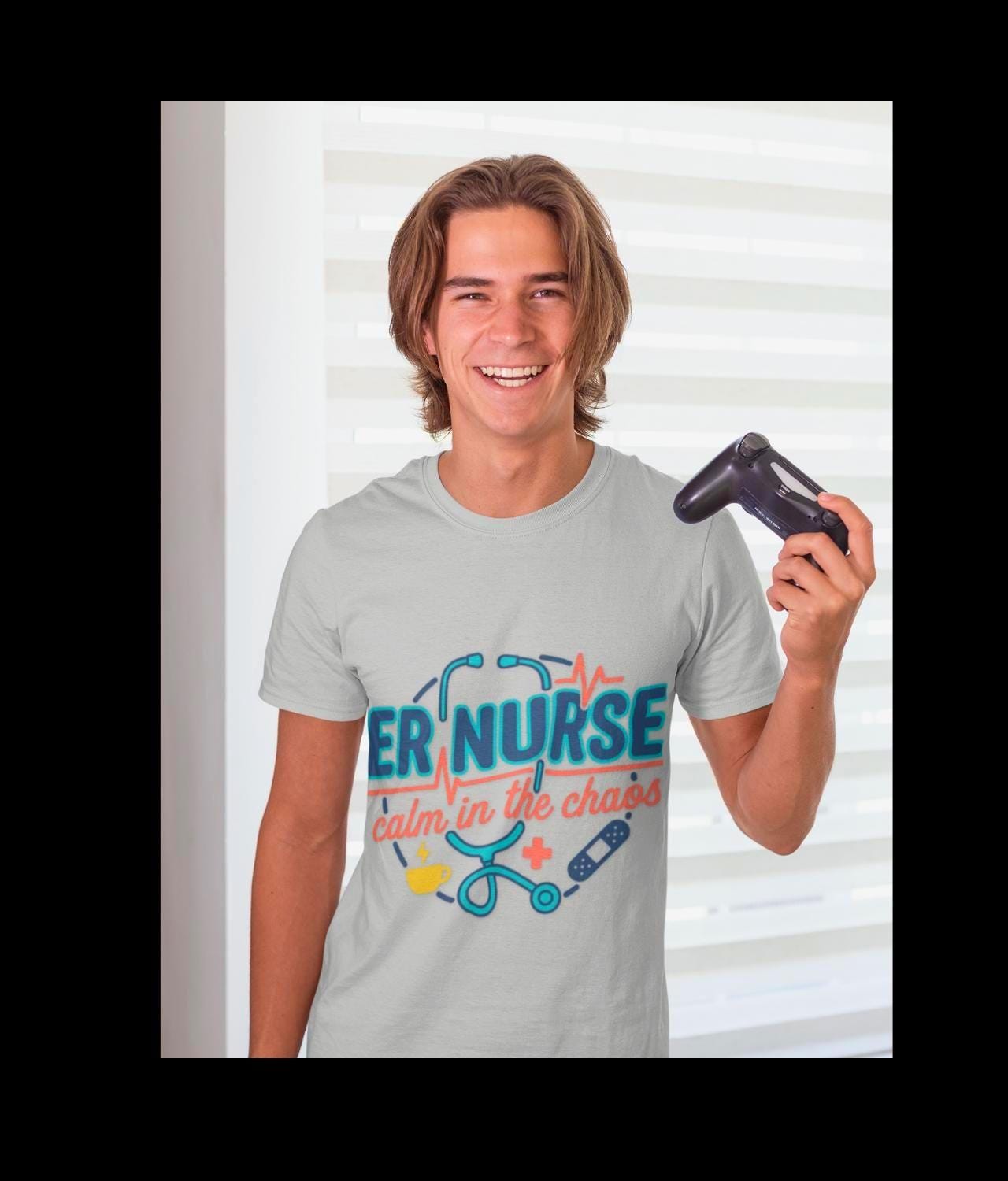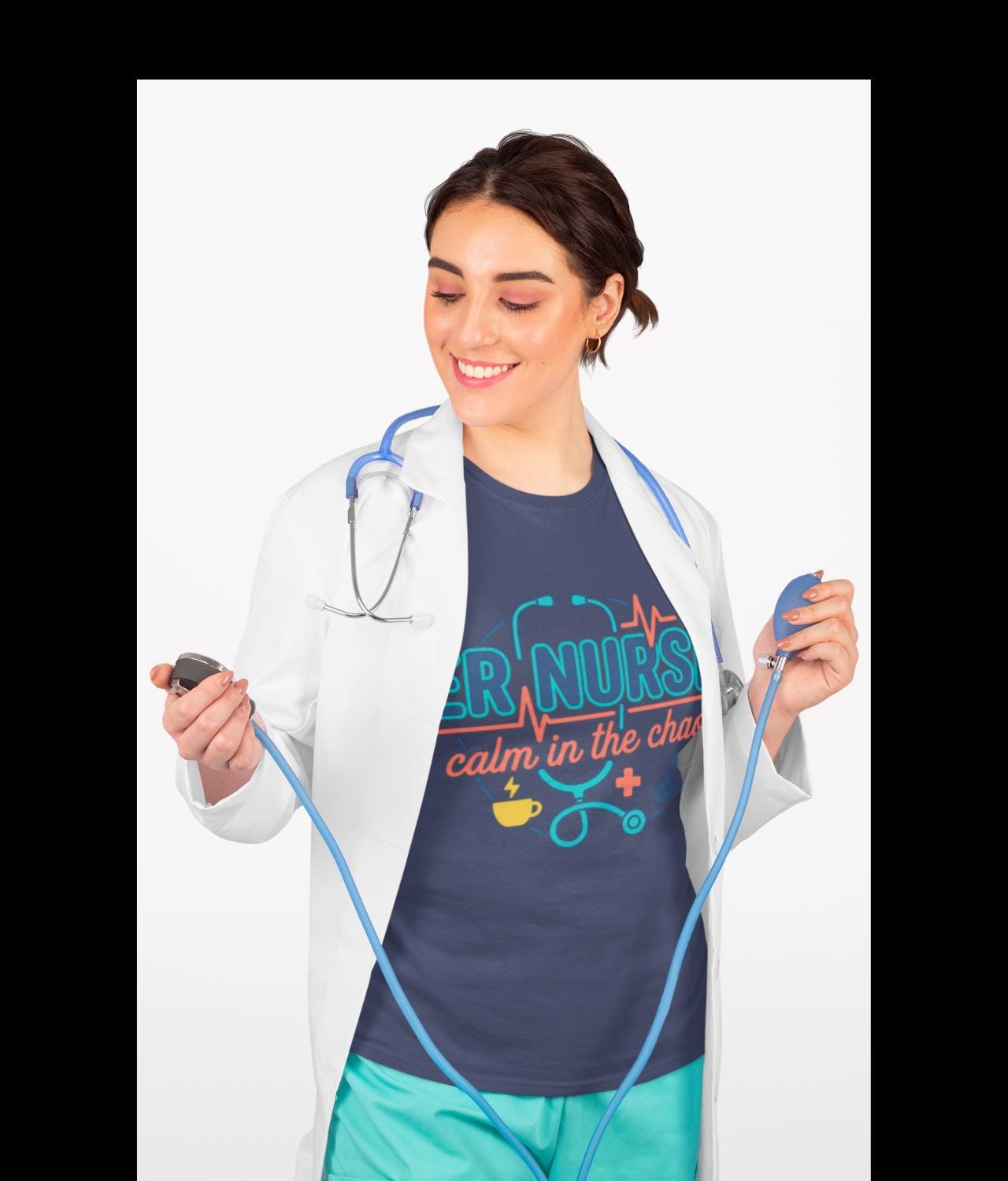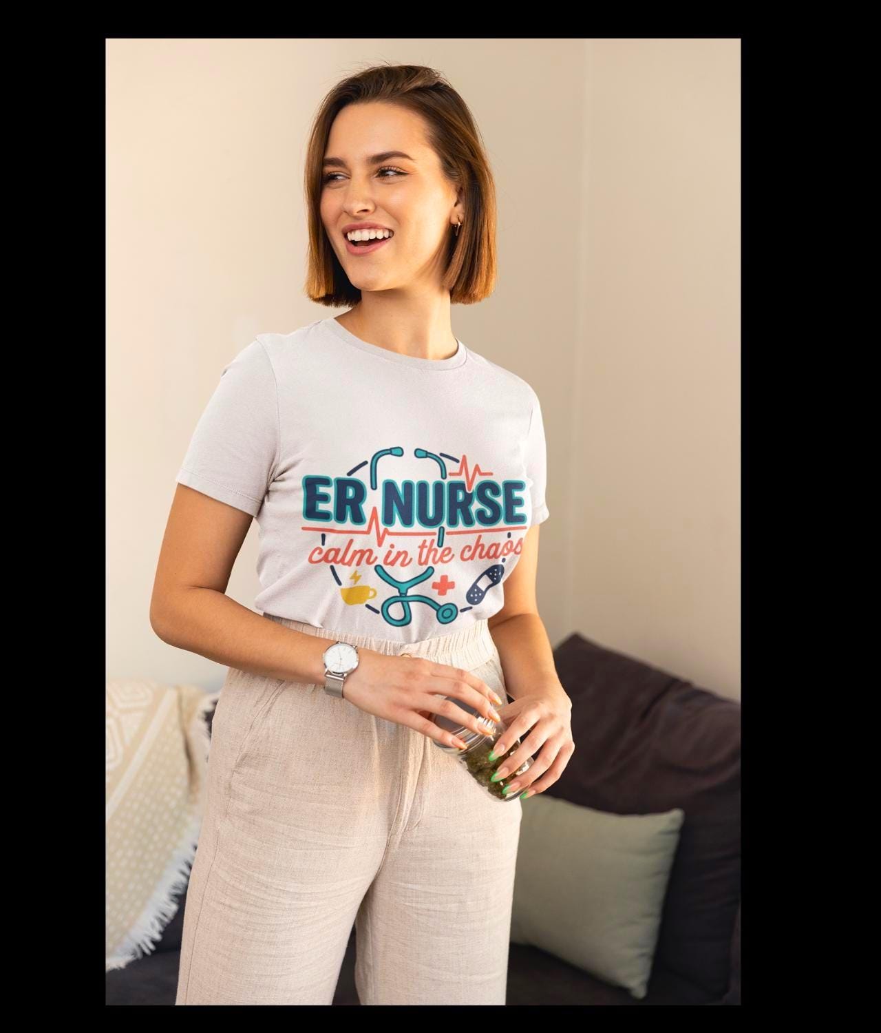 You move through the ER with quiet focus. This tee carries that calm — a simple stethoscope line and the words “calm in the chaos” that nod to long shifts, steady hands, and a heartbeat that refuses to race. It sits light against your skin so you can layer it under scrubs or wear it on days off. The crew neck stays neat, the side seams keep the shape after dozens of washes, and the printed label and sleeve details sit smooth and soft so nothing distracts from the work at hand. Wear it between charting and rounds, at late-night coffee runs, or when you finally collapse on the couch; it reads like a small badge of steady presence for anyone who knows what an ER shift really feels like.