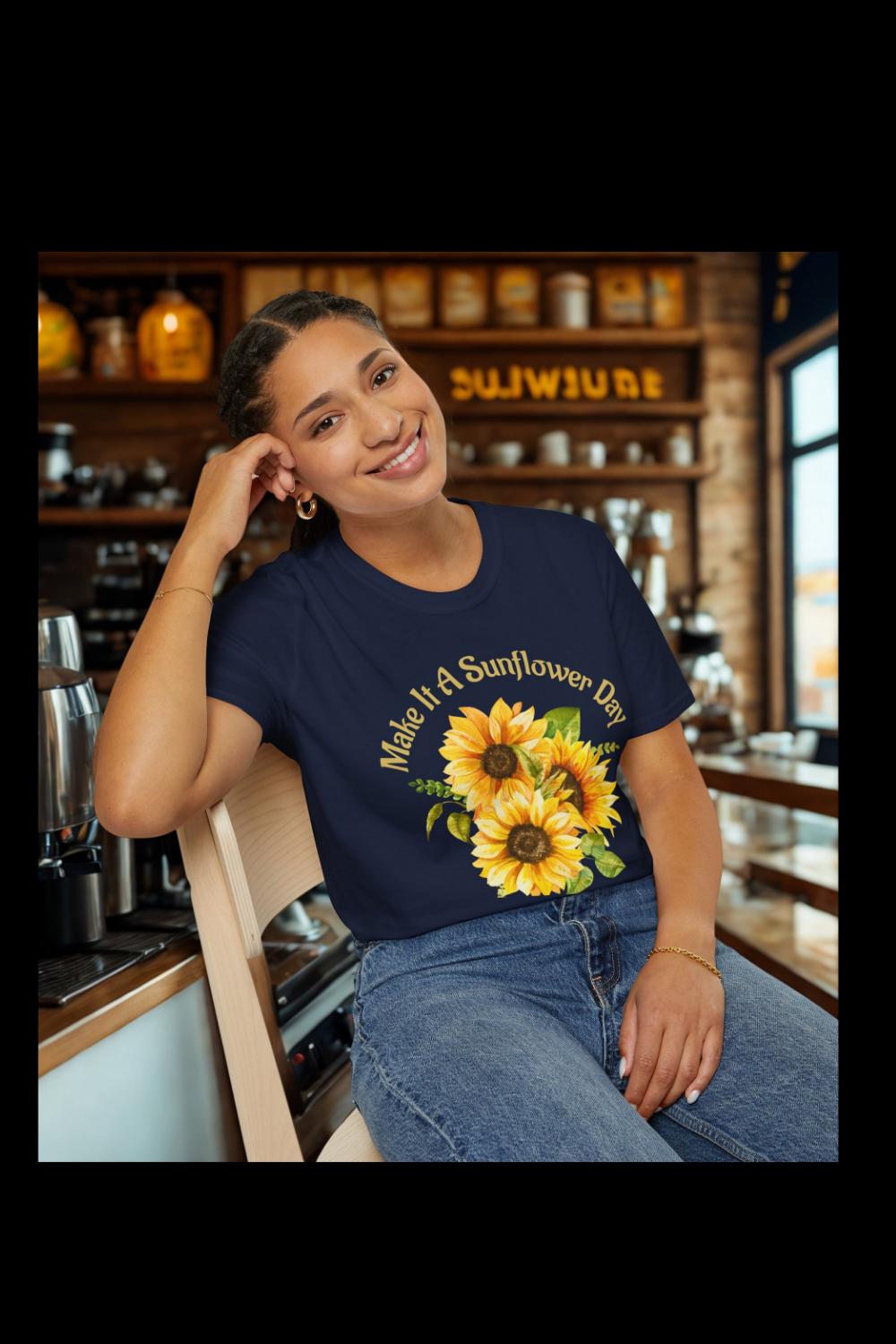 Wake up with sun on your face and a bouquet at your side. This sunflower tee carries a quiet, joyful energy — like a morning spent wandering through a small garden or handing someone a bright stem to lift their day. Lightweight and softly structured, it layers easily under a denim jacket or stands on its own with rolled sleeves and worn-in jeans. The printed sunflower bouquet sits warm and hand-crafted, the kind of design you reach for when you want to feel grounded, sunny, and a touch nostalgic. Wear it to farmers markets, casual brunches, or slow weekend walks when you want your outfit to speak of simple happiness.