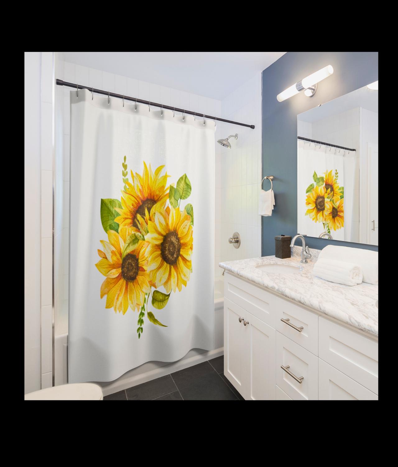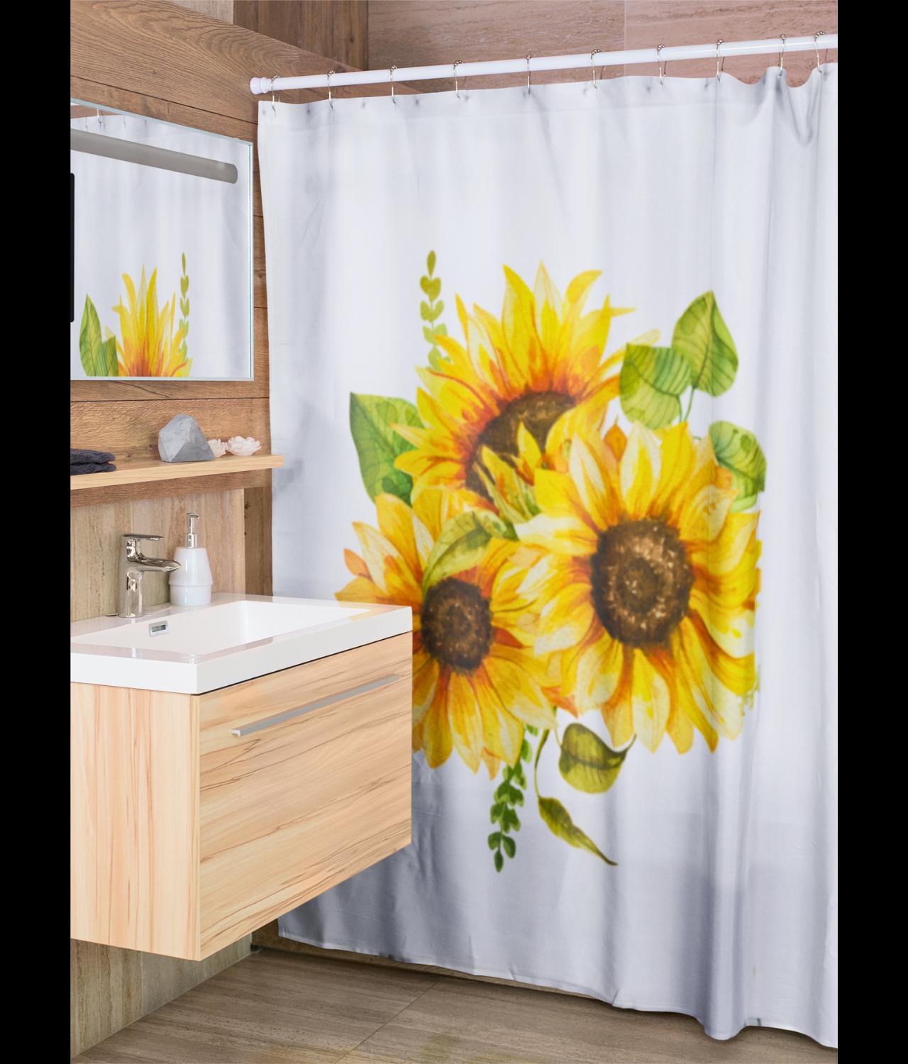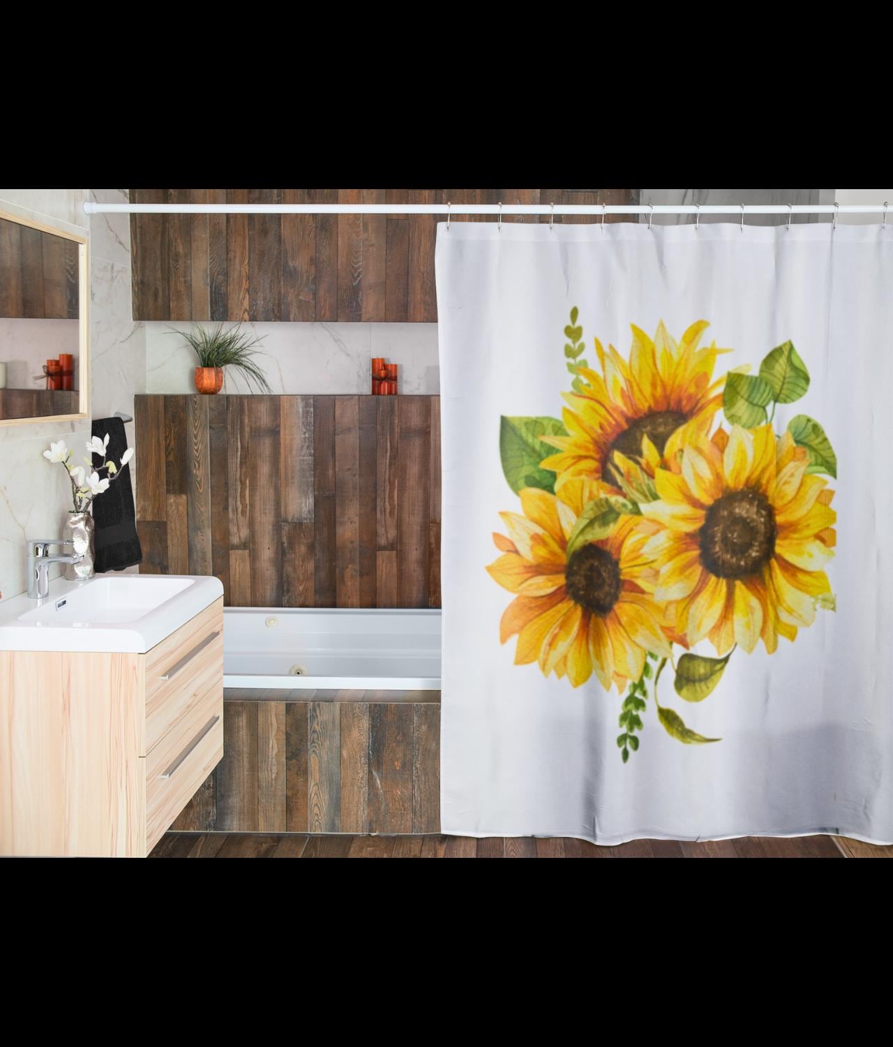 Brighten your bathroom with a sunflower bouquet that feels like sunlight draped across the tub. Bold yellow blooms stretch in a painterly cluster, lifting a small, tired morning into something warmer and steadier. The curtain’s colors read cleanly from across the room — sunflower gold, soft greens, and cream highlights — giving the space a hand-tended, cottage-luxe mood. Hang it in a guest bath to make arriving feel like stepping into a cheerful studio, or let it anchor your own routine with a quiet, botanical lift. The fabric moves with a soft, substantial drape, so each bloom keeps its shape whether the shower’s running or the window’s open. It speaks to people who collect sunlight — plant lovers, makers, and anyone who prefers a home that feels curated and cared for. Works especially well for spring refreshes, brightening short winter days, or welcoming visitors after a long trip.