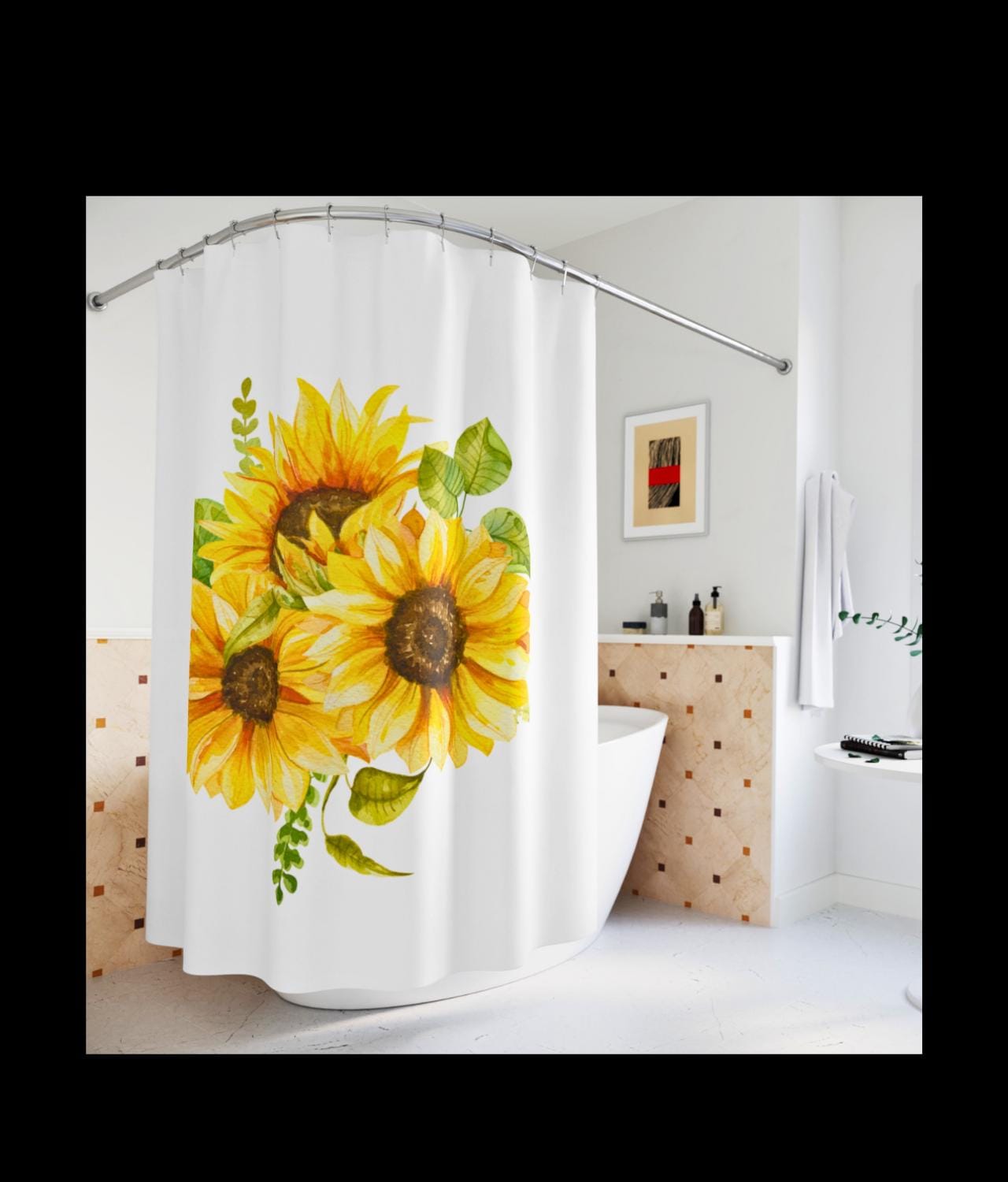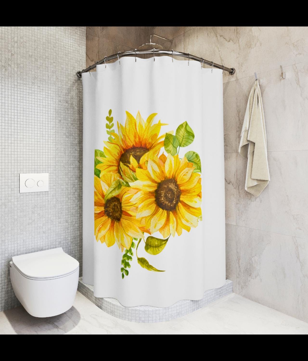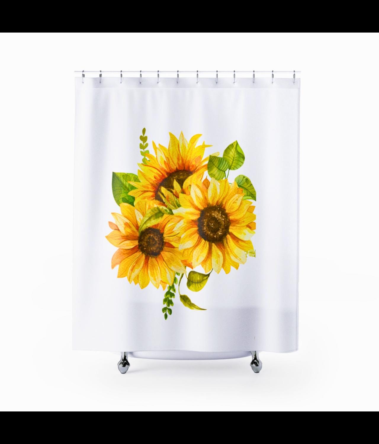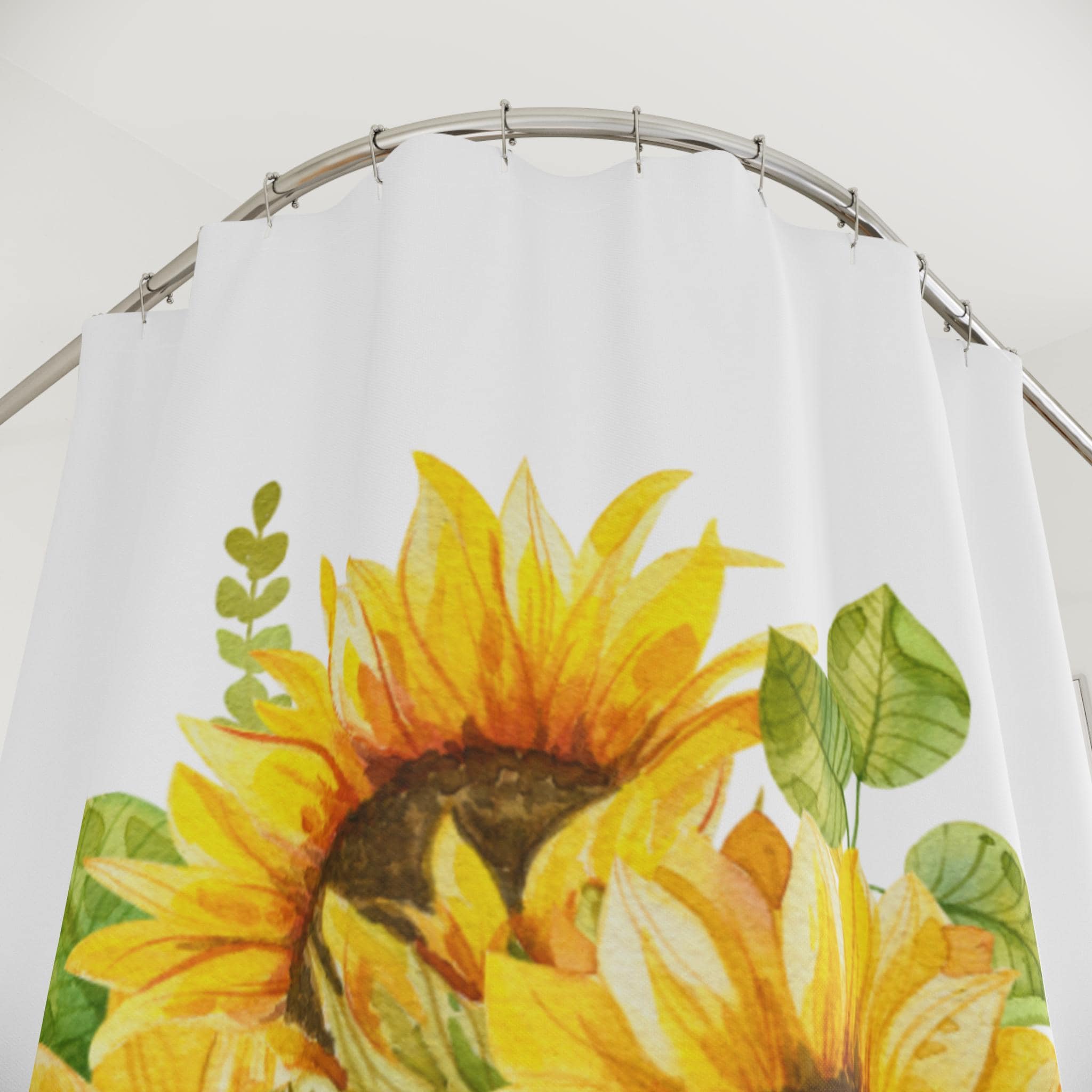 Brighten your bathroom with a sunflower bouquet that feels like sunlight draped across the tub. Bold yellow blooms stretch in a painterly cluster, lifting a small, tired morning into something warmer and steadier. The curtain’s colors read cleanly from across the room — sunflower gold, soft greens, and cream highlights — giving the space a hand-tended, cottage-luxe mood. Hang it in a guest bath to make arriving feel like stepping into a cheerful studio, or let it anchor your own routine with a quiet, botanical lift. The fabric moves with a soft, substantial drape, so each bloom keeps its shape whether the shower’s running or the window’s open. It speaks to people who collect sunlight — plant lovers, makers, and anyone who prefers a home that feels curated and cared for. Works especially well for spring refreshes, brightening short winter days, or welcoming visitors after a long trip.