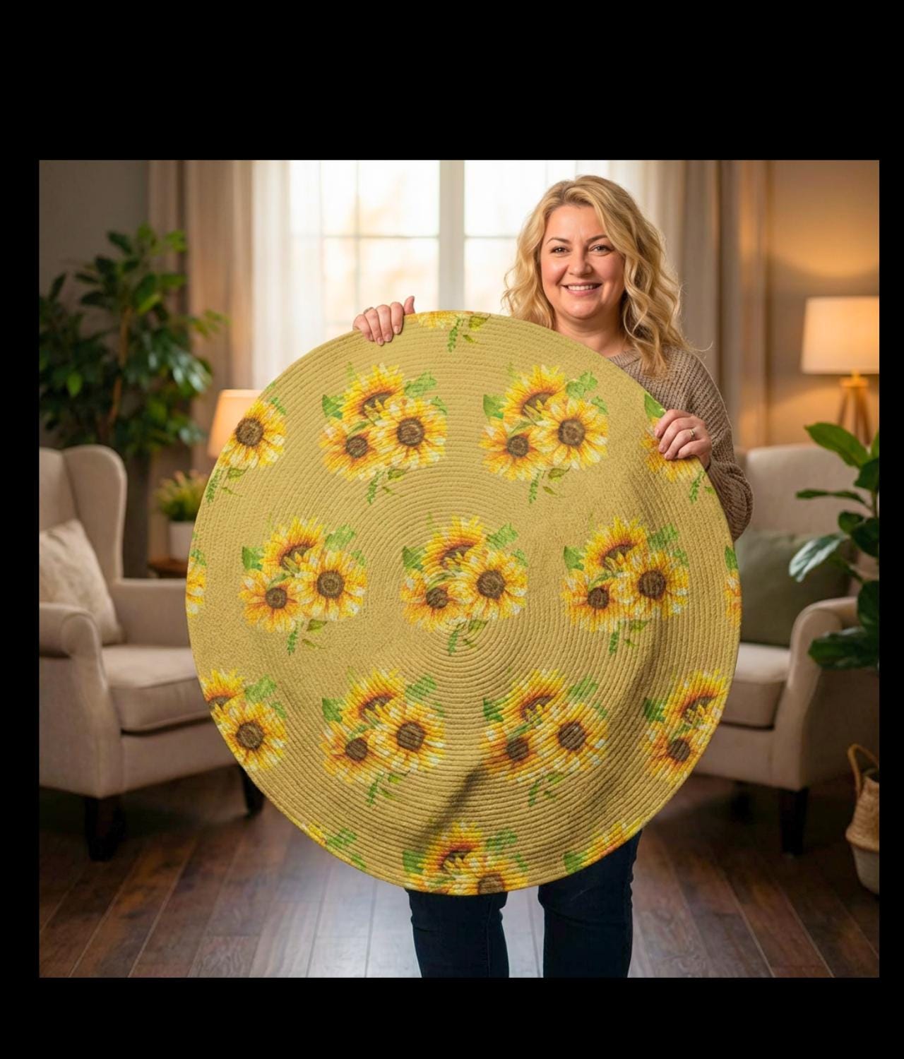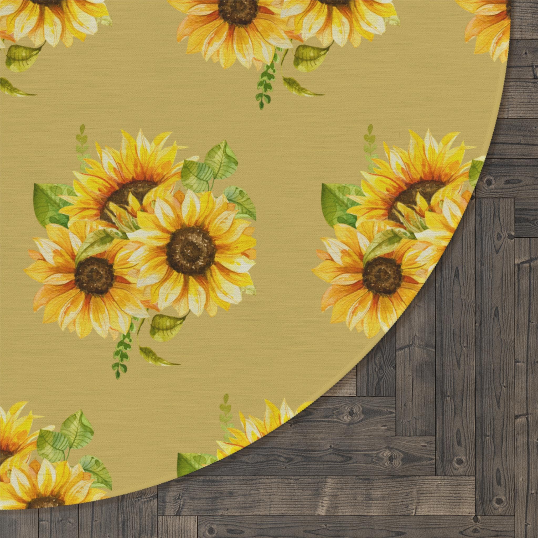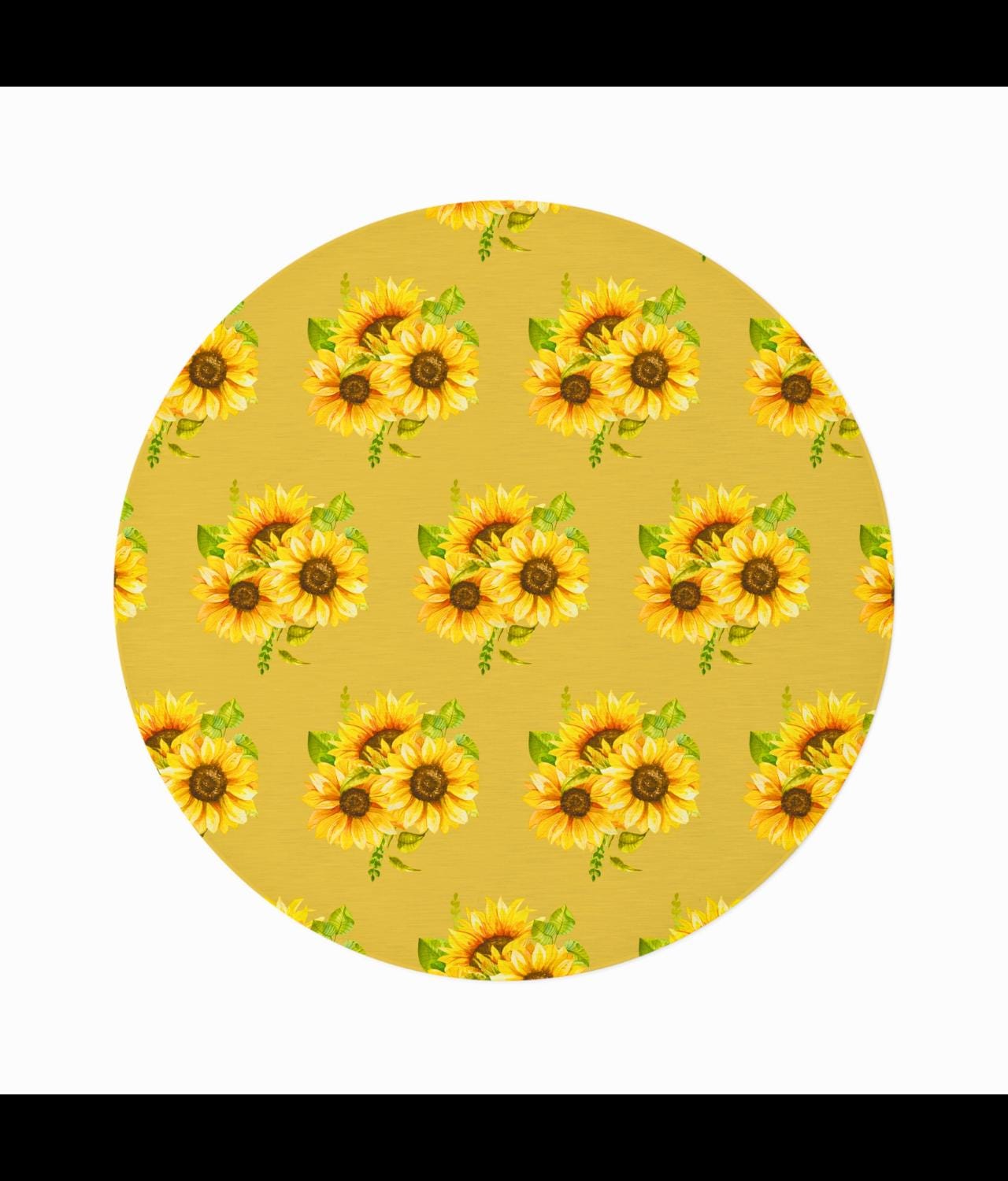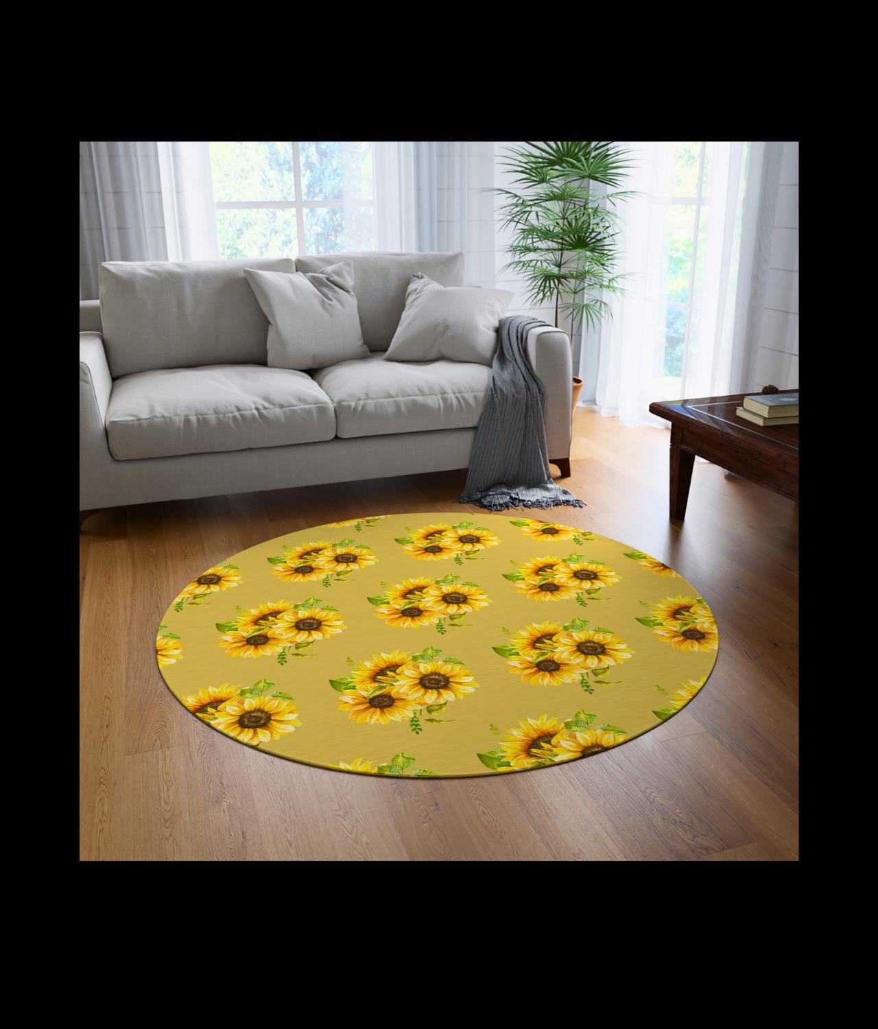 A sunlit circle of warmth and color. This round rug lays down a field of hand-drawn sunflowers—bold golden petals and dark, textured centers—framed by soft greens that feel like a country porch at noon. Step onto the plush polyester chenille and feel a gentle, velvety pile that cushions bare feet and softens rooms. It’s low-profile yet durable, bringing an inviting focal point to breakfast nooks, reading corners, or a quiet spot by the window. The vibrant printing keeps the floral motif lively, while the hemmed edges and textured face stand up to daily life. This rug reads like a small, wearable bouquet for your floor—bright, grounded, and quietly joyful for moments when you want your space to feel warmer and more lived-in.