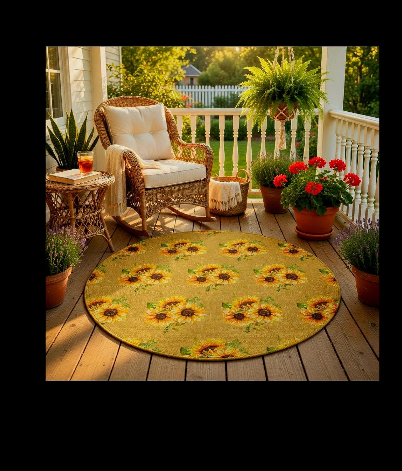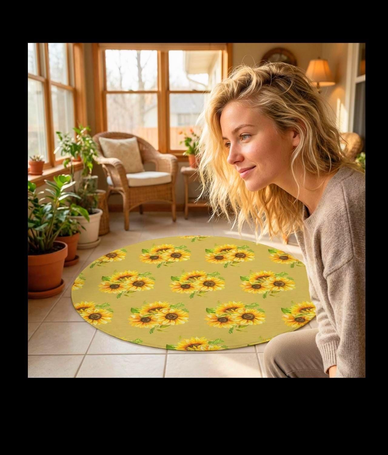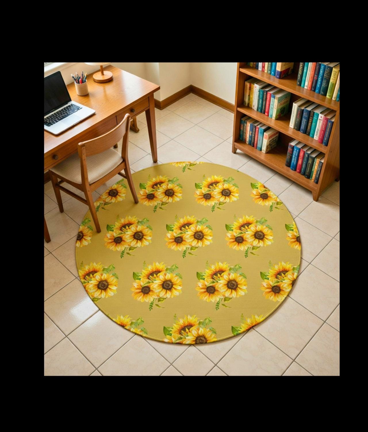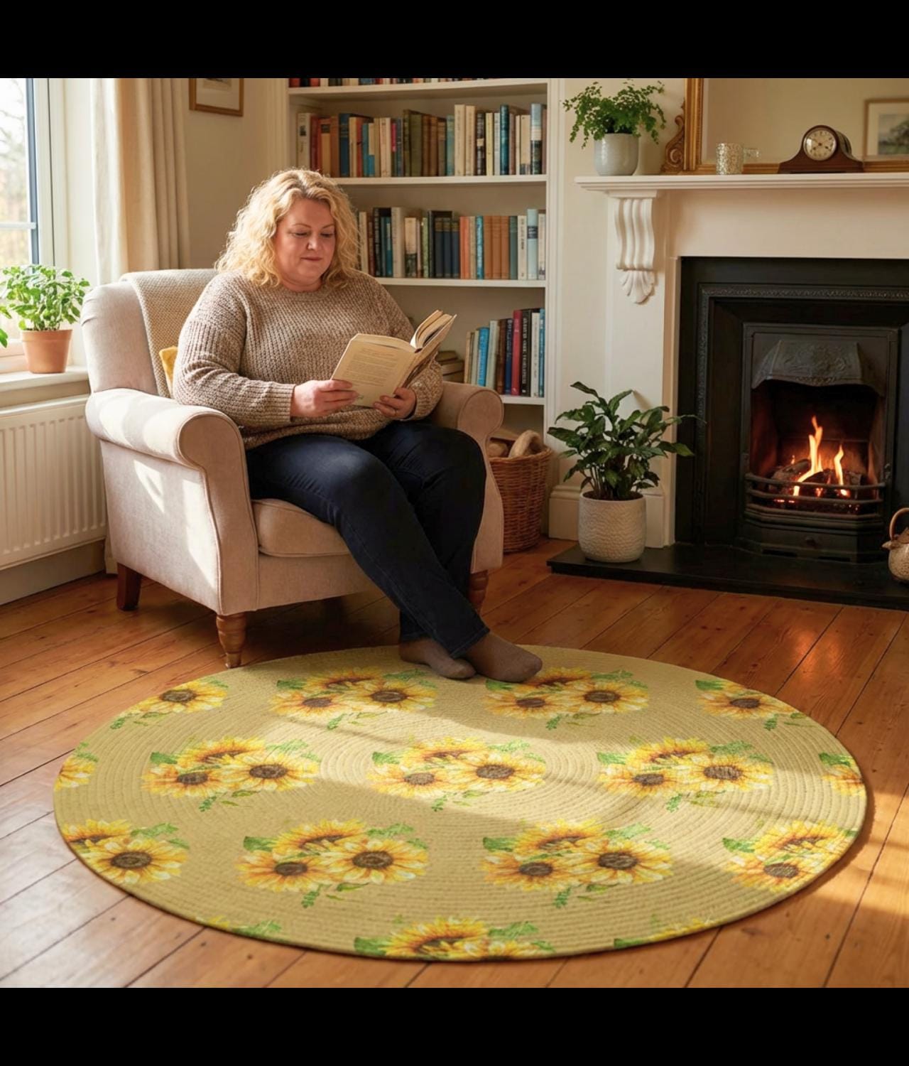 A sunlit circle of warmth and color. This round rug lays down a field of hand-drawn sunflowers—bold golden petals and dark, textured centers—framed by soft greens that feel like a country porch at noon. Step onto the plush polyester chenille and feel a gentle, velvety pile that cushions bare feet and softens rooms. It’s low-profile yet durable, bringing an inviting focal point to breakfast nooks, reading corners, or a quiet spot by the window. The vibrant printing keeps the floral motif lively, while the hemmed edges and textured face stand up to daily life. This rug reads like a small, wearable bouquet for your floor—bright, grounded, and quietly joyful for moments when you want your space to feel warmer and more lived-in.