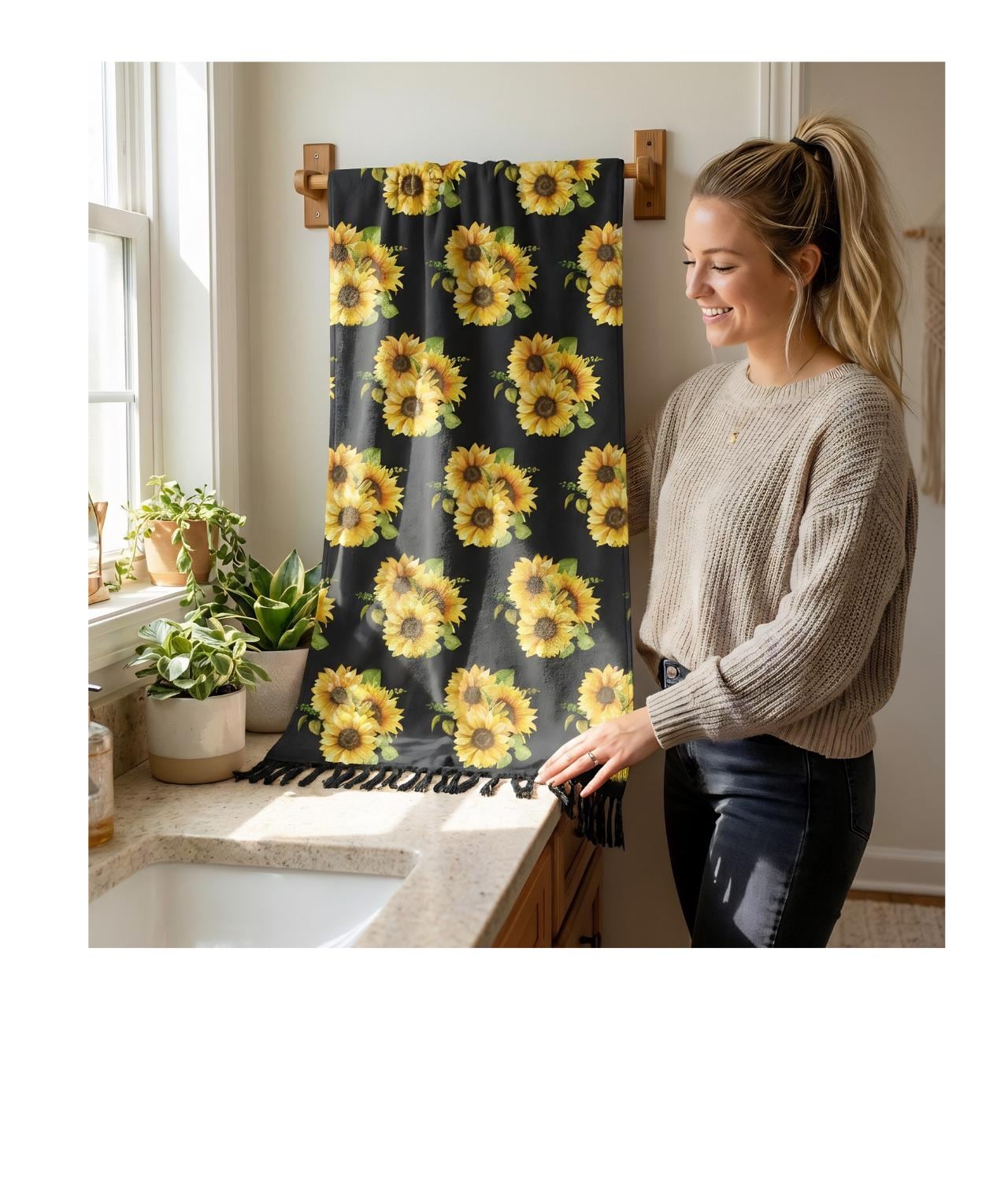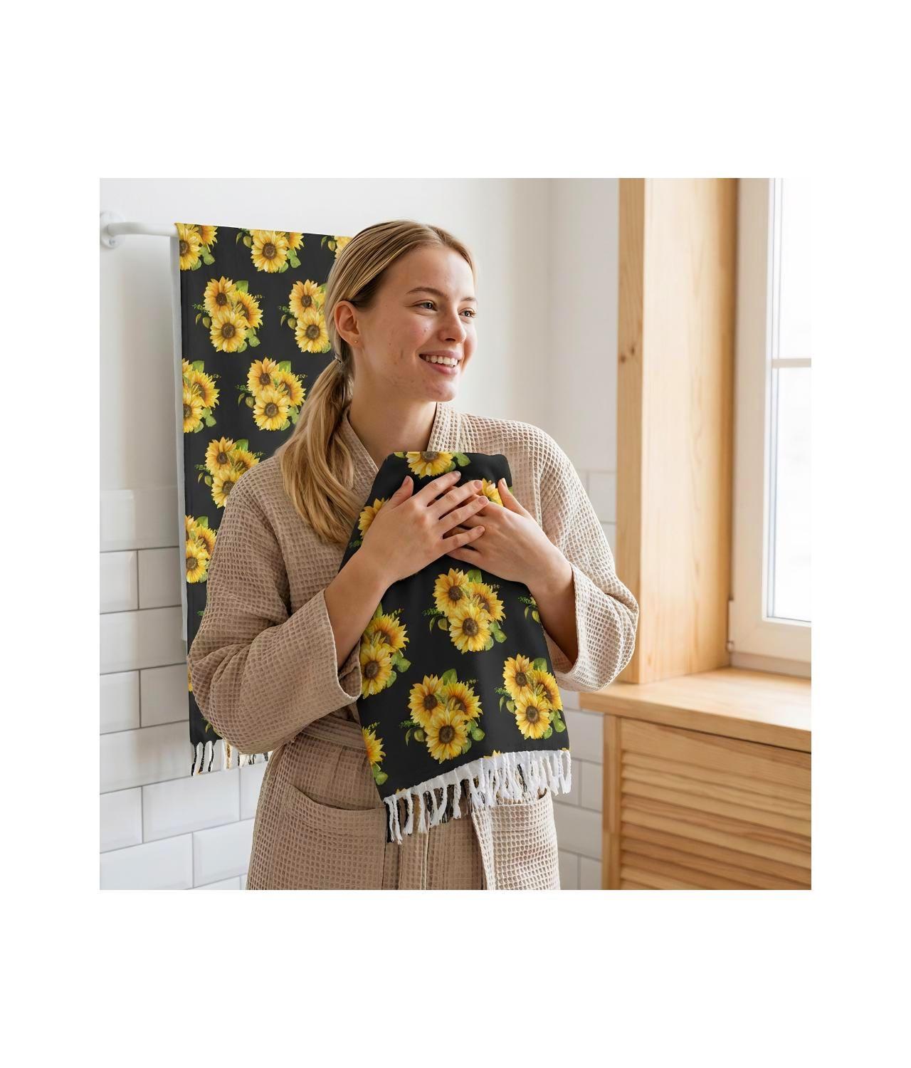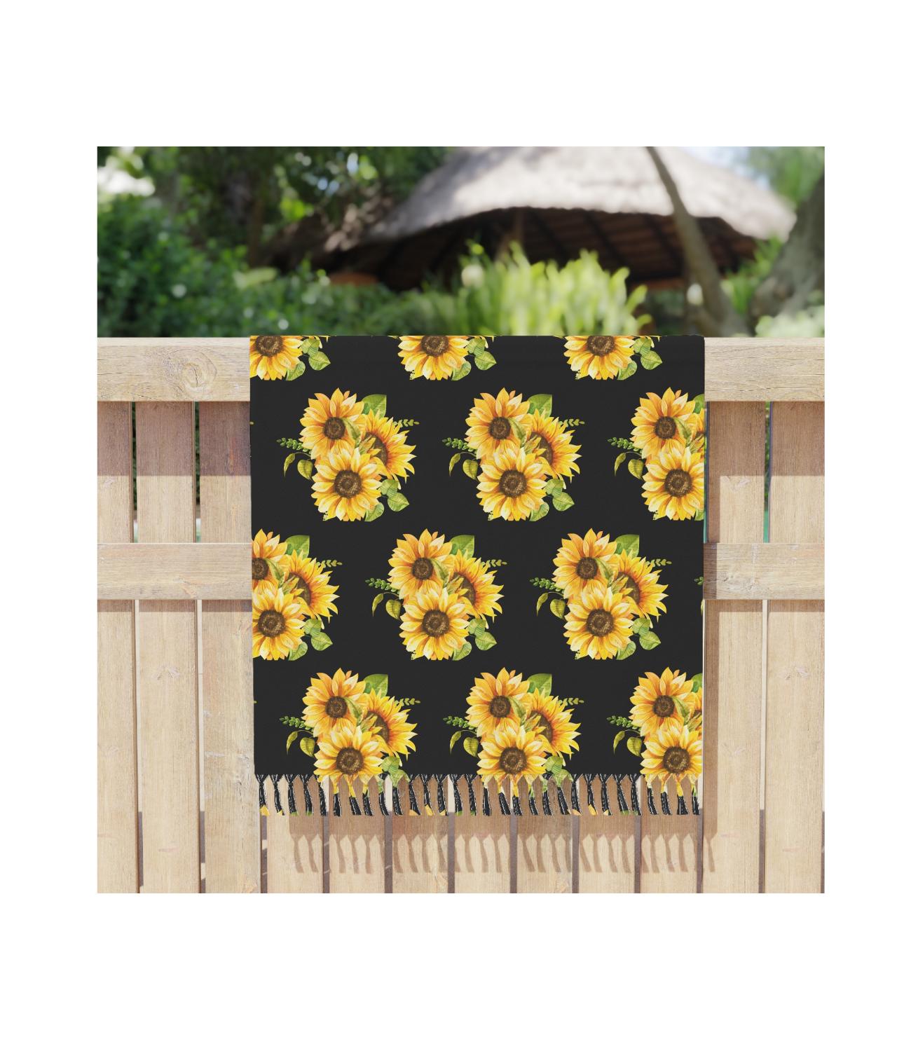 A lightweight boho beach cloth patterned with a sunlit sunflower bouquet. It drapes like a warm breeze—bright, earthy, and a touch vintage—bringing sun-drenched color to shorelines, picnic blankets, or hammock days. Fold it into a travel wrap, lay it out for barefoot afternoons, or knot it around your shoulders when the sea breeze turns cool. The sunflower motif and knotted tassels add handcrafted charm that feels lived-in and personal. This cloth slips easily into a daypack and comes alive in golden-hour light, inviting slow conversation and sandy toes.
