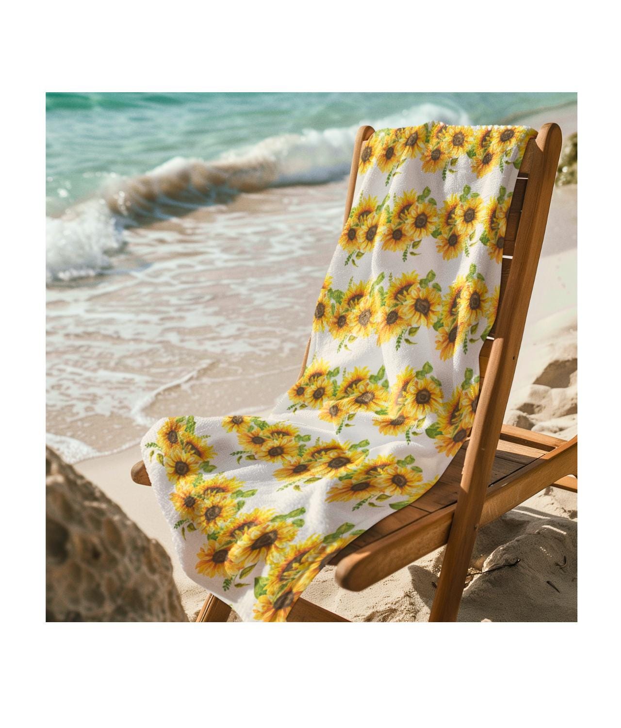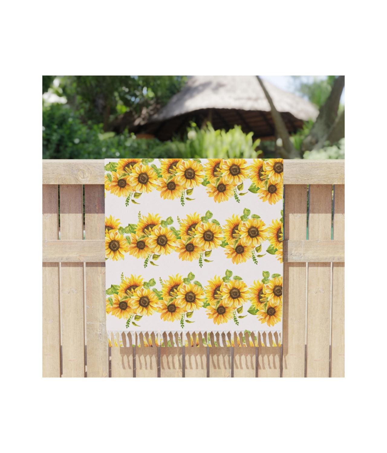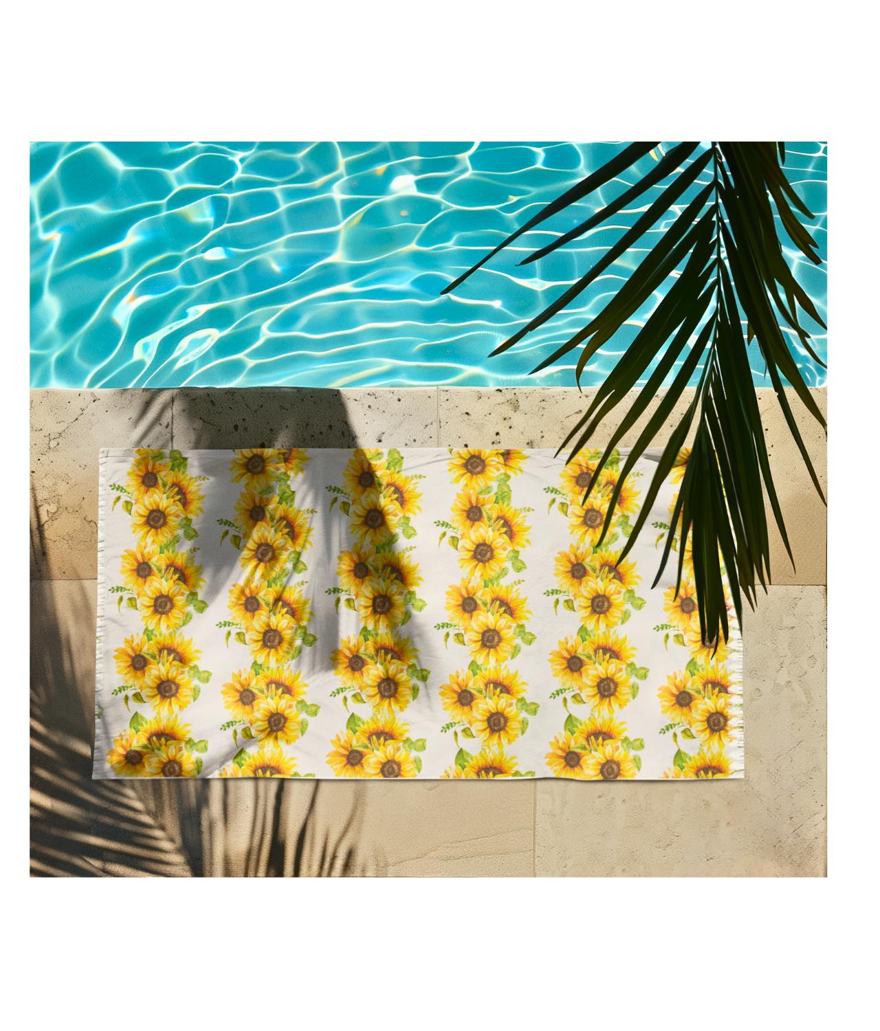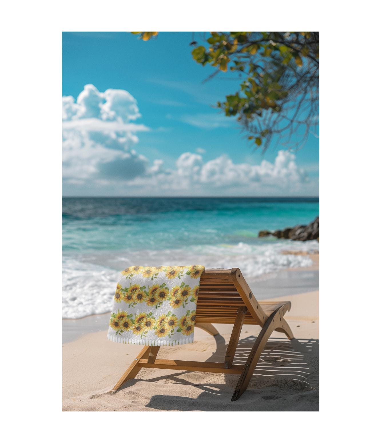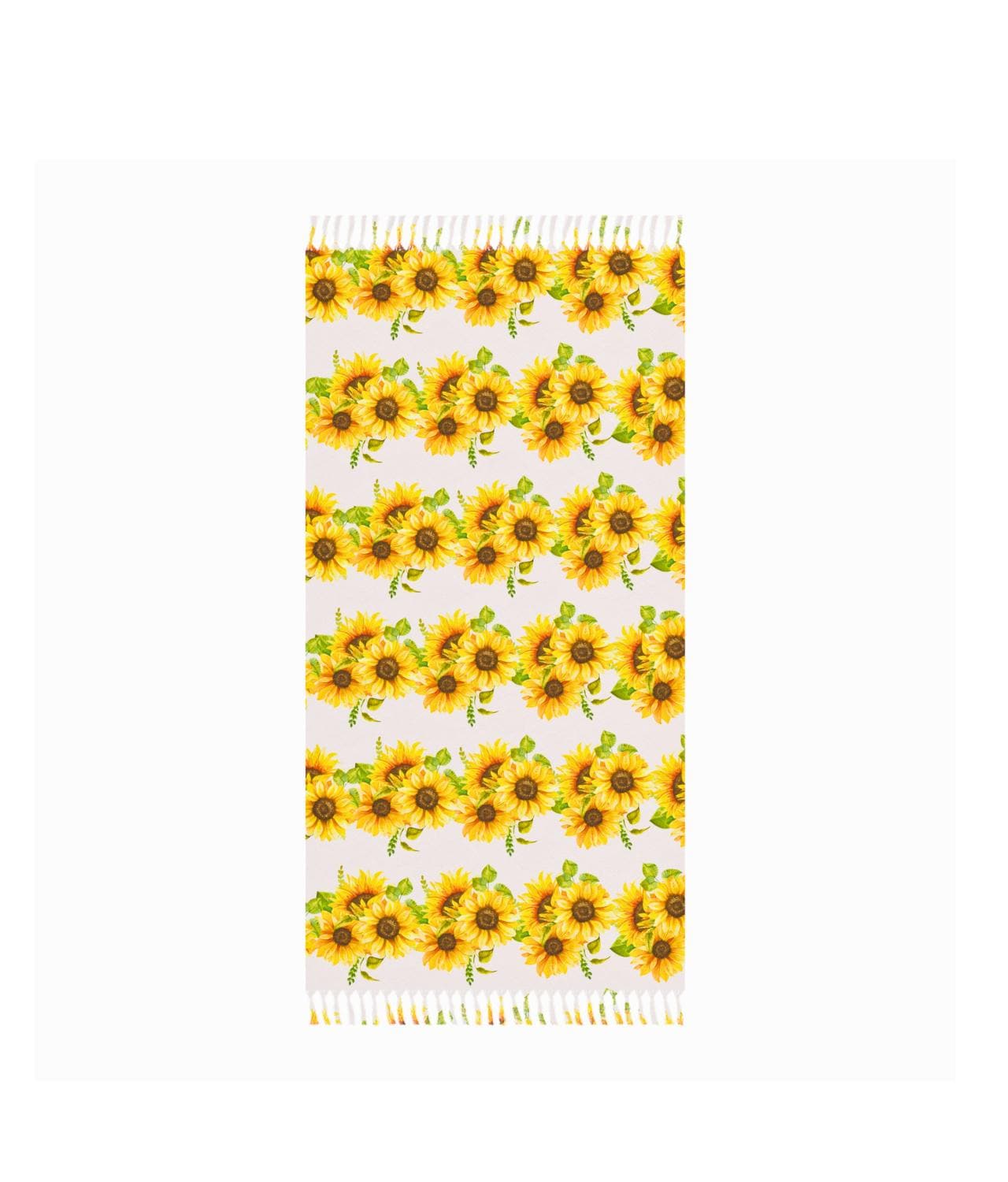 Sun-bleached afternoons and salty air meet a burst of wild sunflowers. This lightweight beach cloth lays flat on sand or a picnic blanket, a bright floral bouquet that lifts the mood and refuses to fade after one summer. It’s soft against skin, wicks water and dries fast, so it moves with you from morning beach walks to bonfire nights. The long, tasseled edges give it a relaxed, bohemian feel — draped over a towel, tied as a sarong, or spread under a seaside bouquet of shells. For people who chase daylight and quiet shorelines, this cloth feels like a small ritual: unfurl, breathe, and let the sunflower print carry the moment.