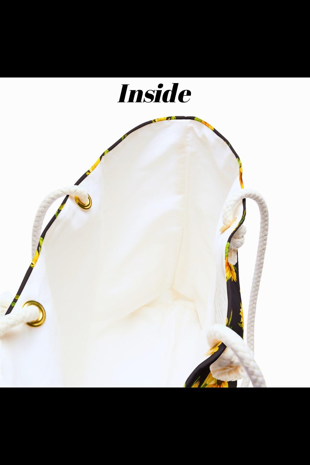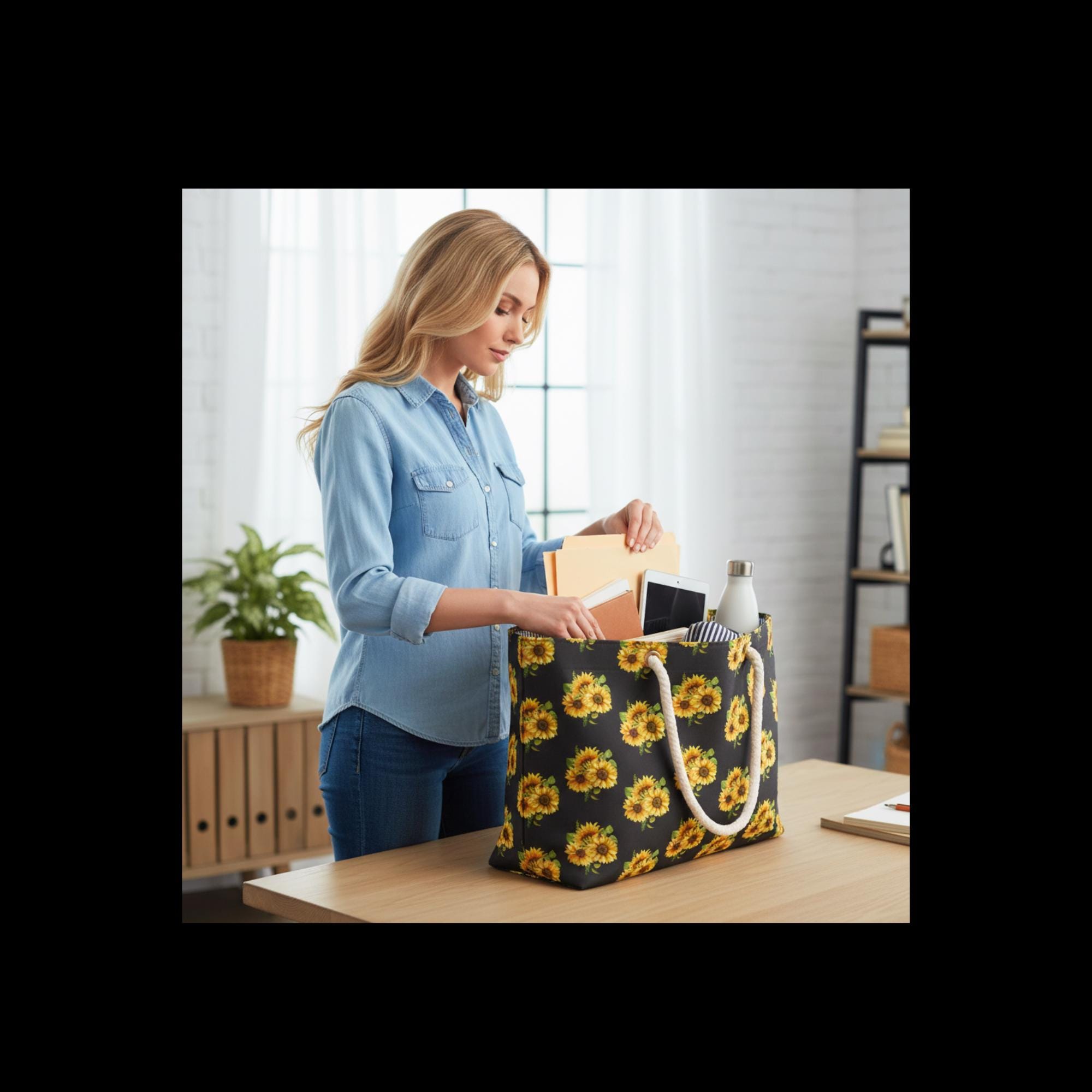 Sun-warmed mornings and salt-sprayed afternoons—this Weekender Bag carries that summer feeling with quiet confidence. A bright sunflower pattern ripples across durable spun-poly fabric, the yellow blooms popping against clean cream rope handles. The roomy T-bottom silhouette holds a towel, a paperback, sunscreen, and an extra shirt without looking overstuffed. Inside, a soft cream sheeting lining keeps fragile items snug and makes it easy to find small things between dips in the sand. Sturdy gold-tone grommets anchor the rope handles so you can shoulder the bag and walk—to the boardwalk, a weekend market, or a friend’s lakehouse—still feeling like you brought the sun with you.